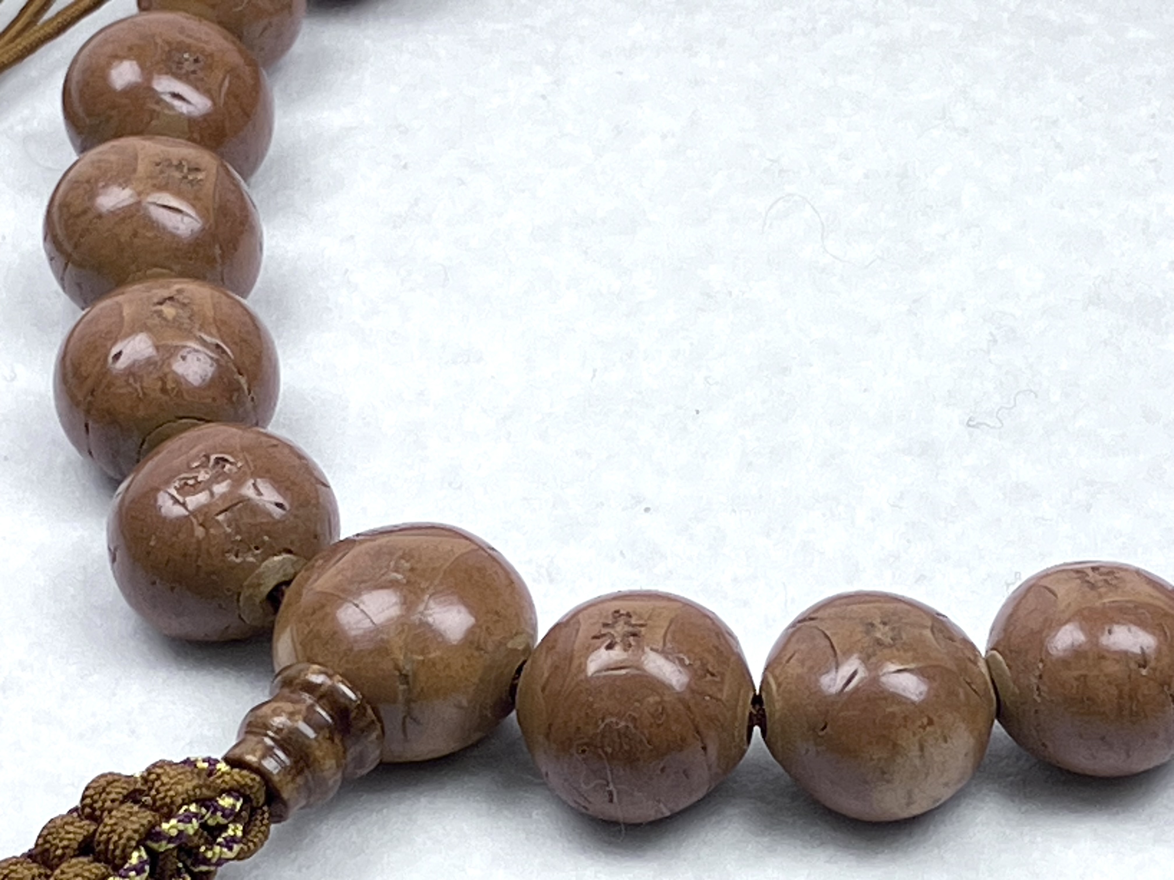 珠の 1つ 1つに虎の眼を思わせる独特の四角い模様が印象的な虎眼菩提樹です。