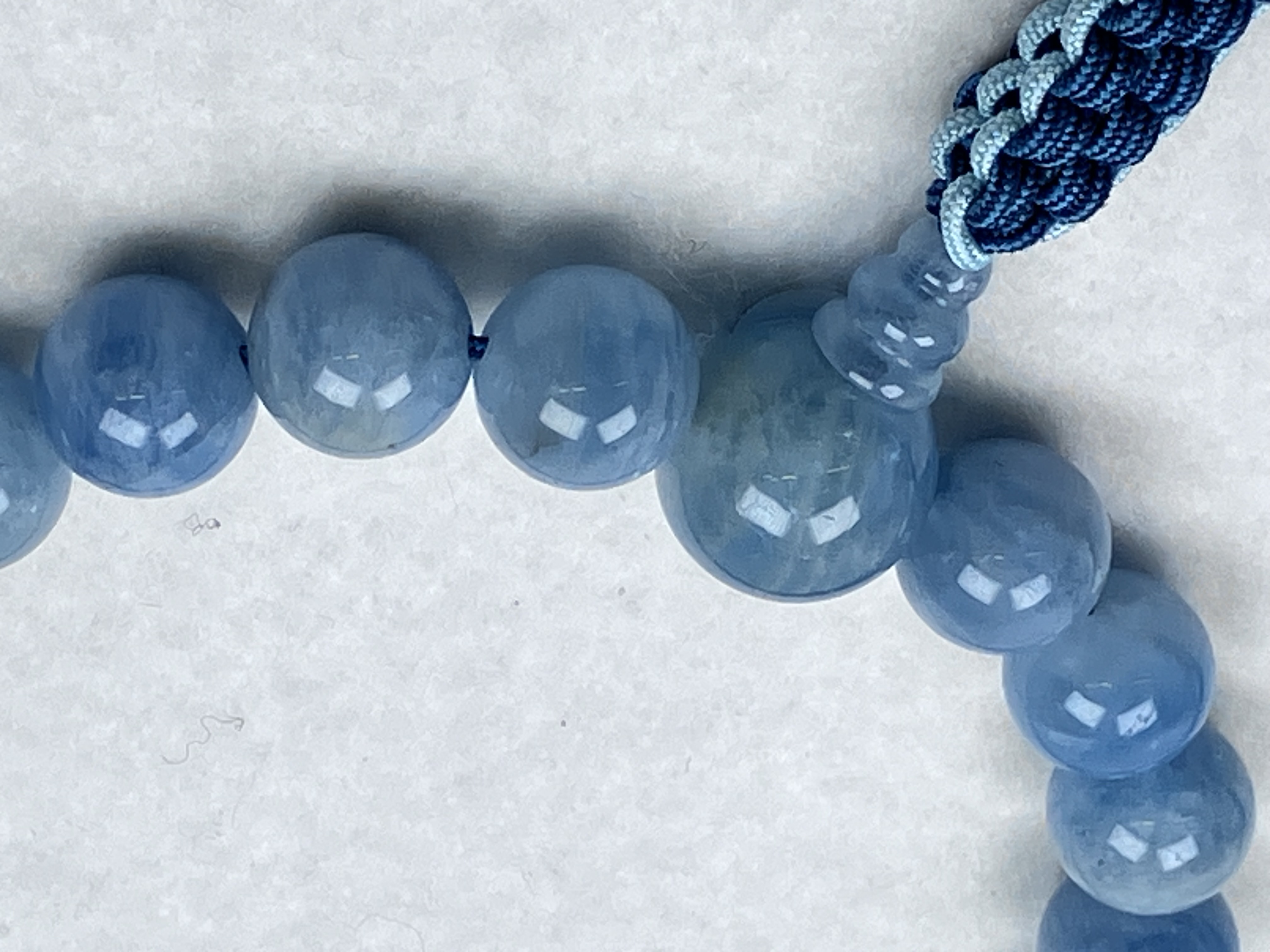 やさしい水色が美しく印象的なお念珠です。
