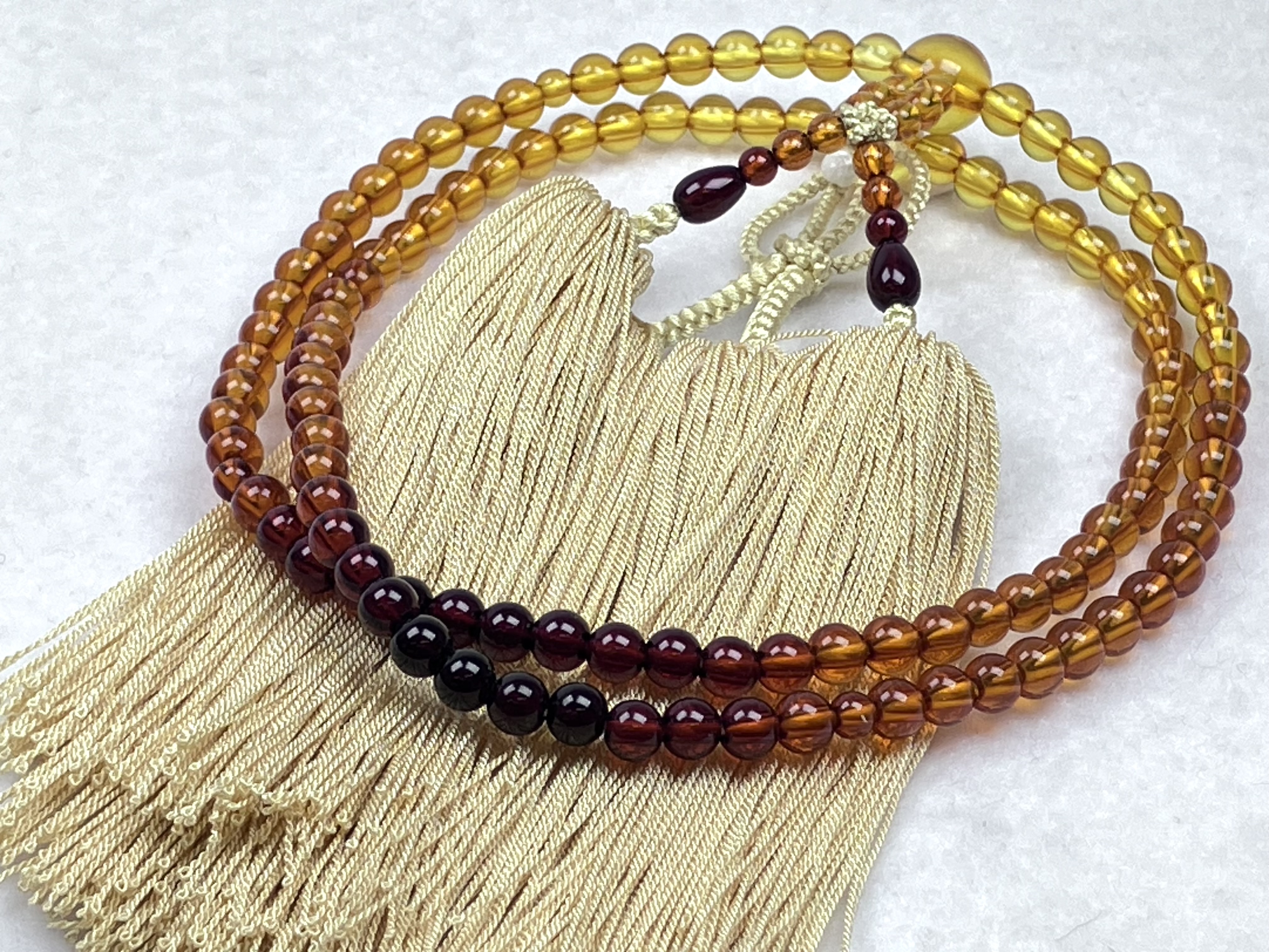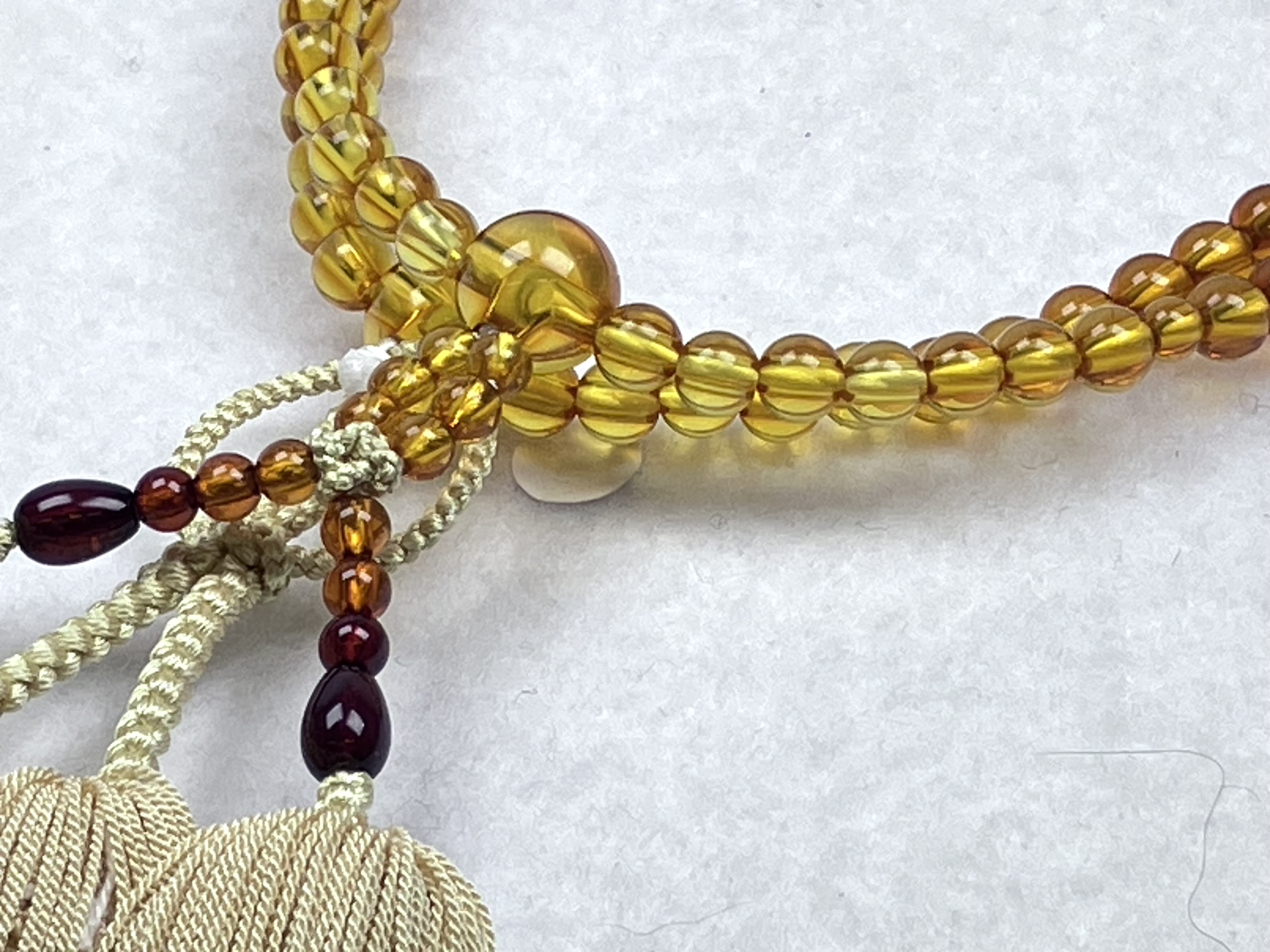 やわらかな飴色の美しい琥珀グラデーション。温もりを感じさせるお念珠です。