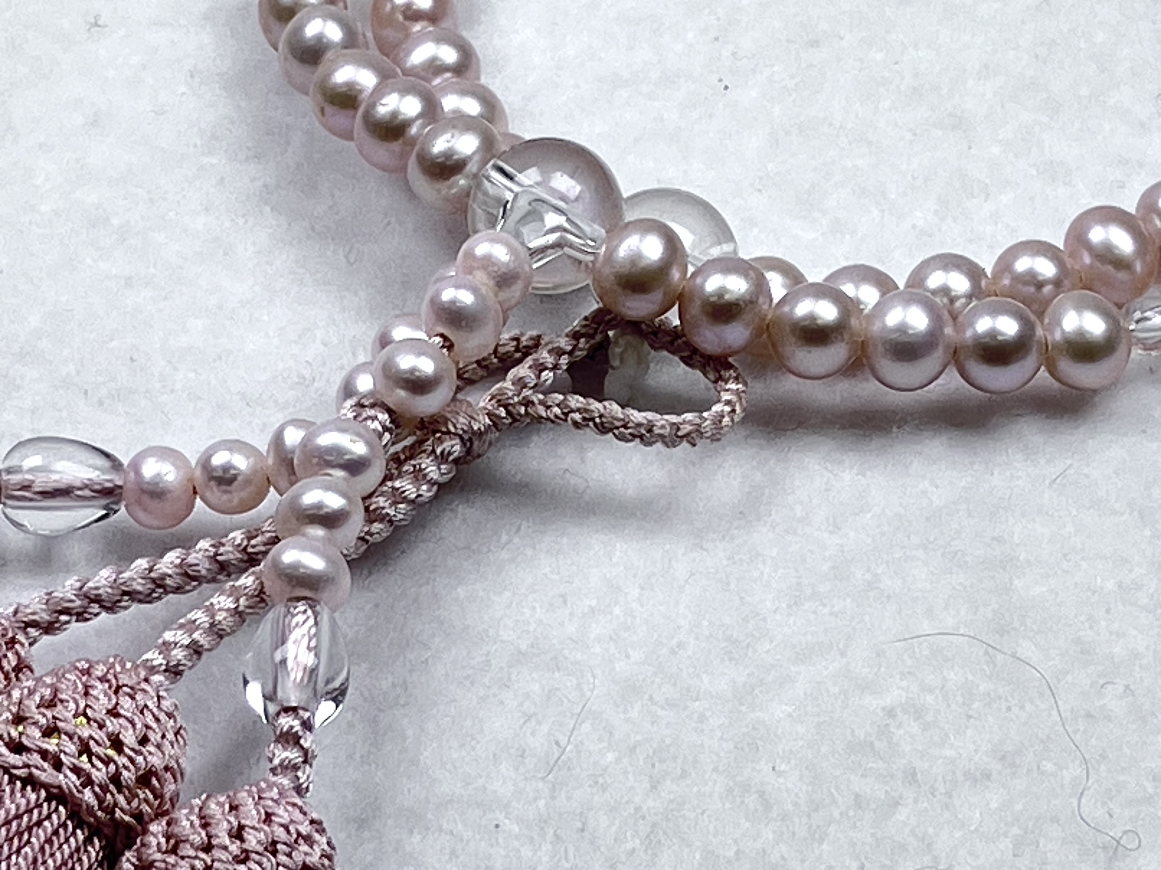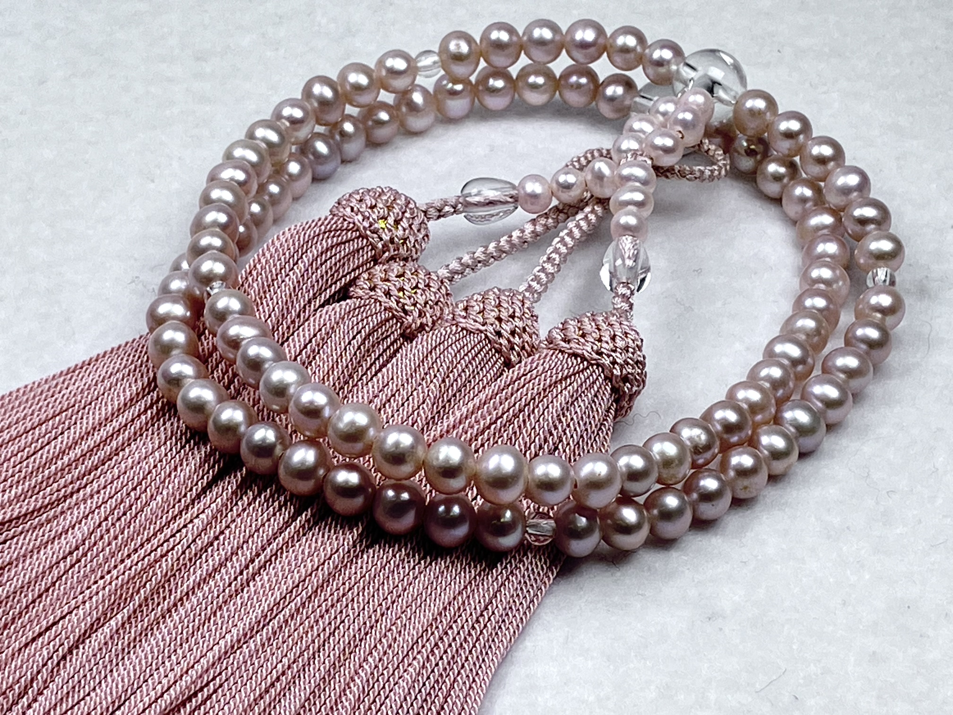 やわらかなピンク色の輝きの淡水真珠と透明感あふれる本水晶のお仕立です。清楚で優しい印象のお念珠です。