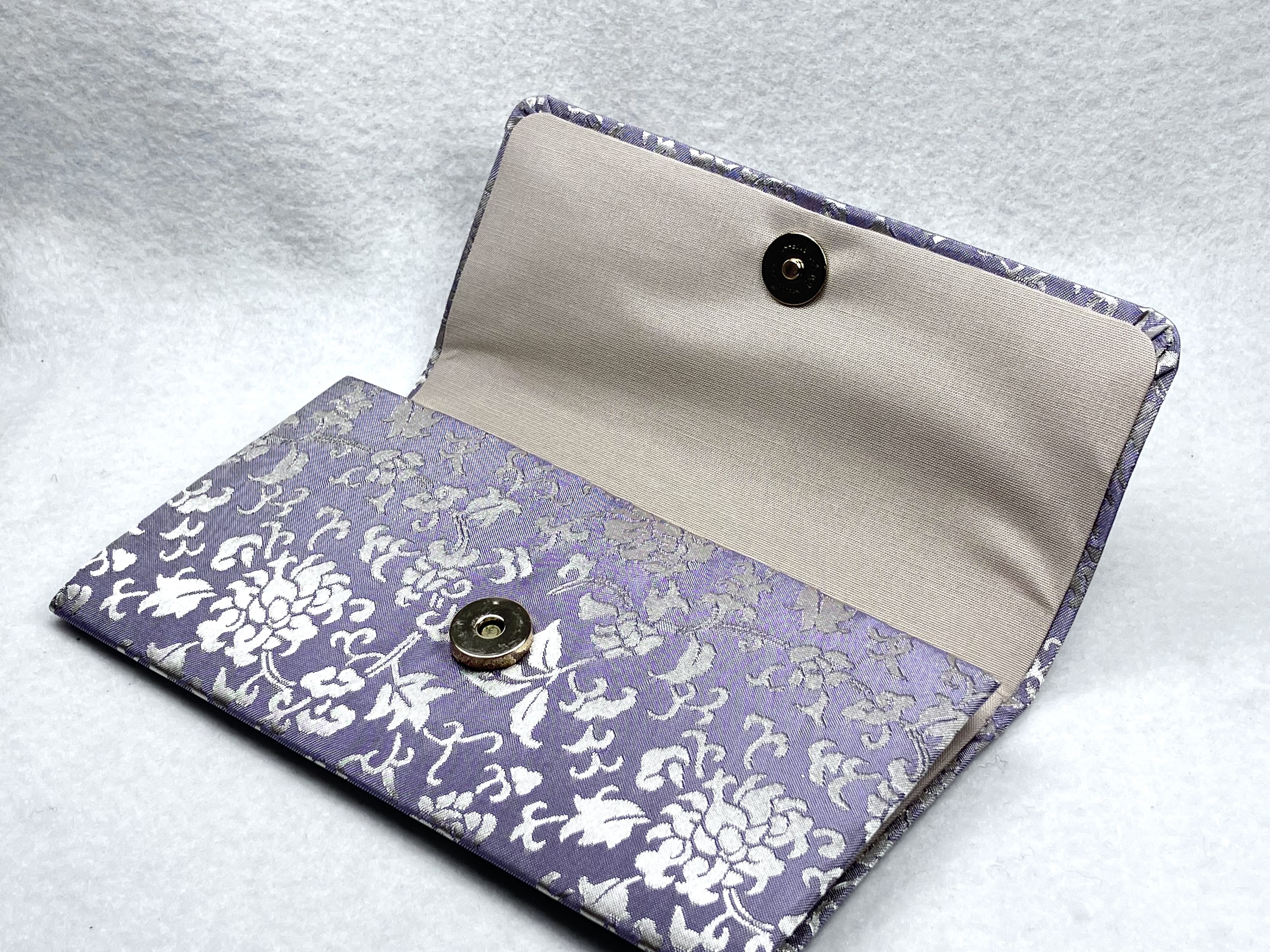 美しい光沢の京緞子に、二重蔓牡丹唐草を配した念珠袋です。